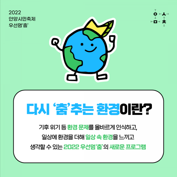 ‘다시 ‘춤’추는 환경’은 기후 위기 대응에 있어 ‘시민’의 역할에 주목하고 환경 문제 인식을 확산시키기 위한, 2022 우선멈‘춤’시민축제의 환경 관련 프로그램이다.