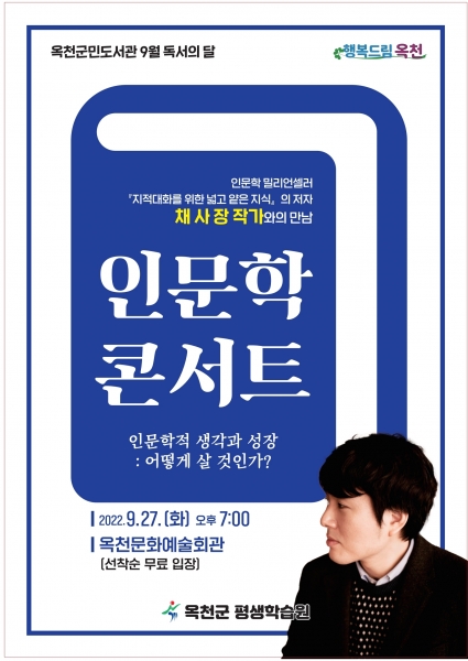 [충청뉴스큐] 옥천군민도서관은 오는 27일 오후 7시 옥천문화예술회관에서 채사장 작가를 초청해 ‘독서의 달 인문학 콘서트’를 개최한다고 밝혔다.