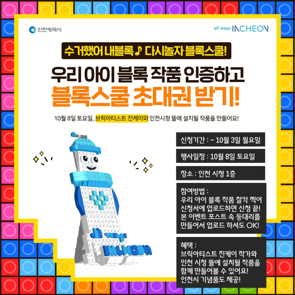 인천광역시는 세계적인 브릭 아티스트 ‘진케이’와 블록작품을 완성해 볼 수 있는 ‘수거했어 내 블록, 다시 놀자 블록스쿨’ 행사를 오는 10월 8일 인천시청에서 진행한다고 밝혔다.