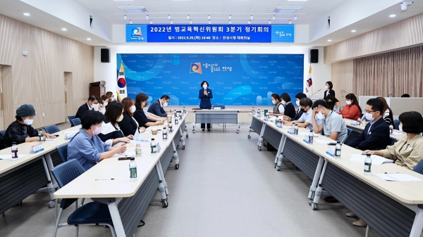 [충청뉴스큐] 안성시는 지난 20일 안성시청 4층 대회의실에서 2022년 3분기 안성시 범교육 혁신위원회 정기회의를 개최했다.