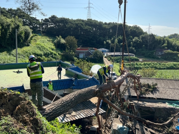 [충청뉴스큐] 당진시 송산면 소재 민우개발가 중장비 2대, 인력 4명을 투입해 강풍으로 인해 송산면 부곡리 농가로 전도된 아름드리 소나무를 제거하는 등 봉사활동을 펼쳐 귀감이 되고 있다.
