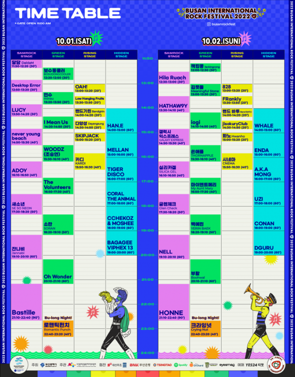 공개된 타임테이블에 따르면 '2022 부산국제록페스티벌'의 첫날인 10월 1일에는 부산을 대표하는 밴드 보수동쿨러를 시작으로 루시 우즈 아도이 더 발룬티어스 새소년 잔나비 오원더 등의 화려한 무대가 예정돼 있다.