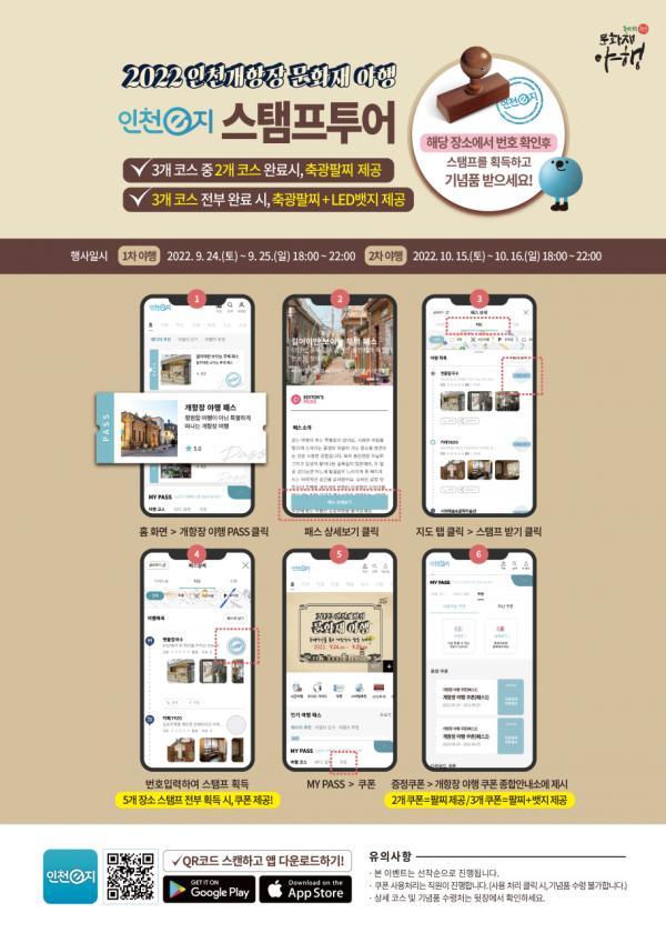 특히 올해 축제에서 처음으로 선보이는 ‘인천e지 스탬프 투어’는 앱 메인화면에 제시된 3개의 테마별 도보패스를 이용하는 것으로 각 여행 지점에 도착해 현장에서 안내하는 번호를 입력하면 스탬프를 획득할 수 있다.