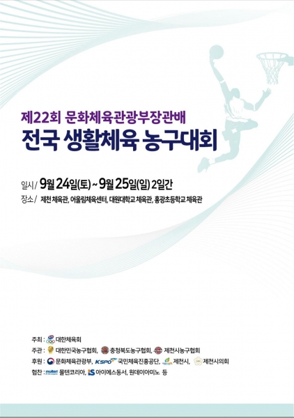 9월 24일부터 25일 까지 이틀간 대한농구협회가 주최하는 ‘제22회 문화체육관광부장관배 전국생활체육농구대회’가 제천체육관과 대원대 등 제천시 일원에서 열렸다.