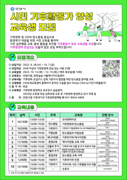 시민 기후활동가 양성교육은 스마트 그린도시 공모사업 중 하나로 기후변화·온실가스 감축 등 탄소중립 기본지식 함양을 위한 분야별 교육을 통해 안양시 시민 기후활동가를 양성하는 과정이다.