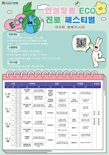 [충청뉴스큐] 안성시는 탄소중립을 주제로 다양한 체험활동 및 그린잡 탐구를 통한 친환경 가치관을 정립하고 진로체험 활성화를 위해 “지구야, 함께 가JOB” 안성맞춤 eco 진로 페스티벌을 운영한다.