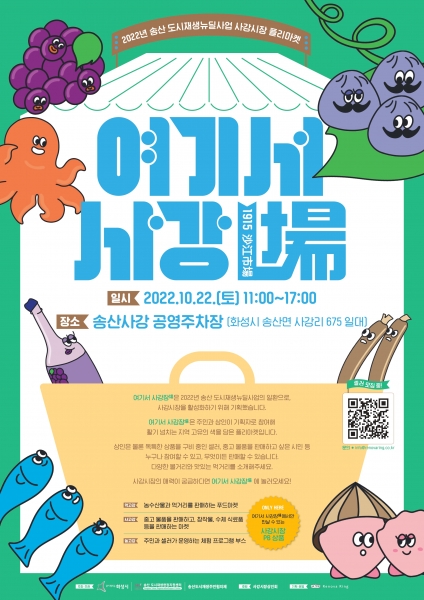 본 행사는 HU공사에서 시행하는 송산면 도시재생뉴딜사업의 일환으로 사강시장의 홍보 및 활성화를 위해 기획됐으며 10월 22일 토요일 오전 11시부터 오후 5시까지 송산사강 공영주차장에서 열린다.