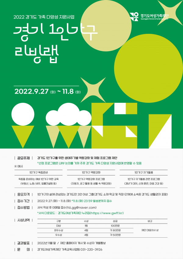 [충청뉴스큐] 경기도여성가족재단이 1인가구 지원을 위한 ‘경기 1인가구 리빙랩’ 공모전을 9월 27일부터 11월 8일까지 개최한다.