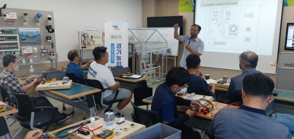 경기도농업기술원은 3월부터 시설하우스 환경관리, 농업 전자전기의 기초, 양액재배 등 21회 84시간의 스마트팜 이론과 실습교육을 진행했으며 현장중심의 문제해결 능력강화를 위해 스마트테스트베드 교육장에서 현장교육을 추진했다.