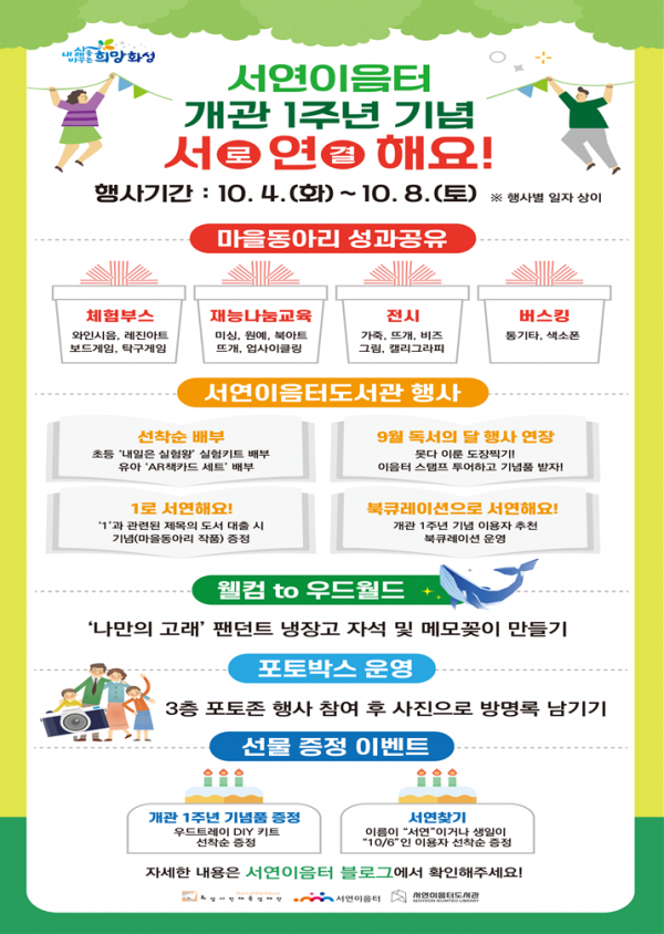 이번 행사는 오는 10월 6일 서연이음터 개관 1주년을 맞이해 마을주민들에게 다채로운 체험 및 이벤트를 제공한다.