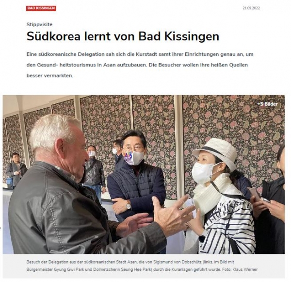 잘레 짜이퉁은 21일 보도를 통해 “한국 아산에서 온 사절단이 지역 온천 산업 활성화를 위해 바트키싱엔을 방문했다”며 “아산은 현대자동차와 삼성전자가 위치한 산업 중심지이자, 600년 전 한 왕이 방문해 온천수로 병을 치유한 역사를 가지고 있다”고 소개했다.