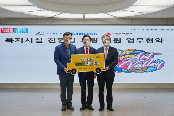 [충청뉴스큐] 아산시가 지난 28일 삼성전자, 충남사회복지공동모금회와 ‘복지시설 친환경 차량 지원사업’을 위한 업무협약을 체결했다.
