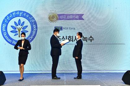 특히 올해는 92개사가 선정된 가운데 ㈜녹수는 능력 중심으로 인재를 채용/관리하고 재직 중 근로자에게 지속적인 교육훈련 기회를 제공하는 등 인적자원개발에 노력한 노사의 상생 성장을 높이 평가받았다.