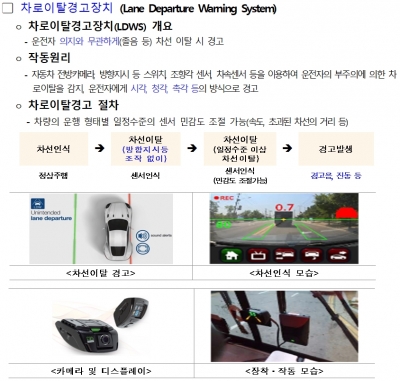 차로이탈경고장치란 졸음운전 등 운전자 의지와 무관한 차로이탈을 감지해 운전자에게 시각, 청각, 촉각 등의 경고를 주는 장치이다. 자동차 전방카메라, 방향지시등 스위치, 조향각 센서, 차속센서 등으로 이탈여부를 감지한다.