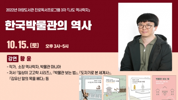 [충청뉴스큐] 안성시 아양도서관은 오는 10월 15일 오후 3시 역사학자 황윤 작가를 초청해 ‘한국박물관의 역사’ 강연회를 개최한다고 밝혔다.