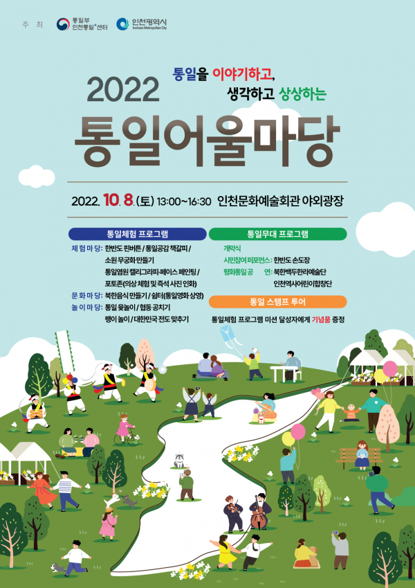 [충청뉴스큐] 인천광역시는 통일부 인천통일플러스센터와 공동으로 ‘2022 통일어울마당’행사를 10월 8일 오후 1시부터 4시30분까지 인천문화예술회관 야외광장에서 개최한다고 밝혔다.