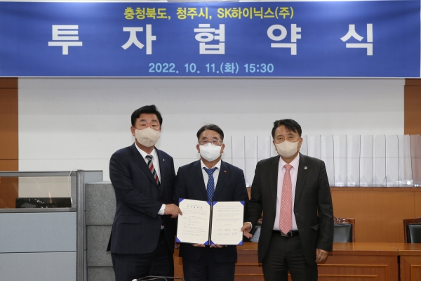 [충청뉴스큐] 청주시는 11일 충북도청에서 이범석 청주시장, 김영환 충청북도지사, 김동섭 SK하이닉스 대외협력담당 사장이 참석한 가운데 M15X 신규 공장 투자협약식을 가졌다고 밝혔다.