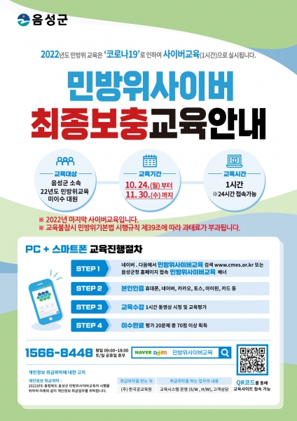 [충청뉴스큐] 음성군은 상반기 기본교육이나 사이버 1차 교육을 받지 않은 우리 군 소속의 22년도 민방위교육 미이수자를 대상으로 민방위사이버 최종보충 교육을 시행한다.