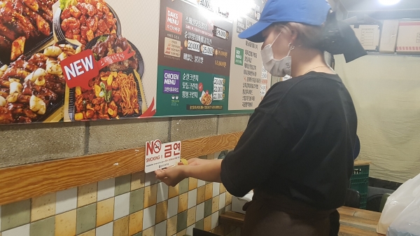 총 47명이 10개팀으로 나뉘어 350개의 업소를 대상으로 금연구역 알림 표지판 부착 여부 흡연실 설치기준 준수 공중이용시설 실내 흡연행위 여부 등에 대해 집중 점검했으며 표지판 관련 53건과 흡연행위 관련 7건에 대해 계도 조치를 완료했다.