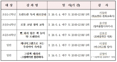상반기 도서관 문화학교는 초등학생을 대상으로 ‘도란도란 독서 하브루타’, ‘로봇 코딩 창의 교육’, ‘뻔 하지 않은 책 놀이 북 트레일러’ 등을 개설해 교과와 연계한 창의적인 내용의 수업이 이뤄진다.