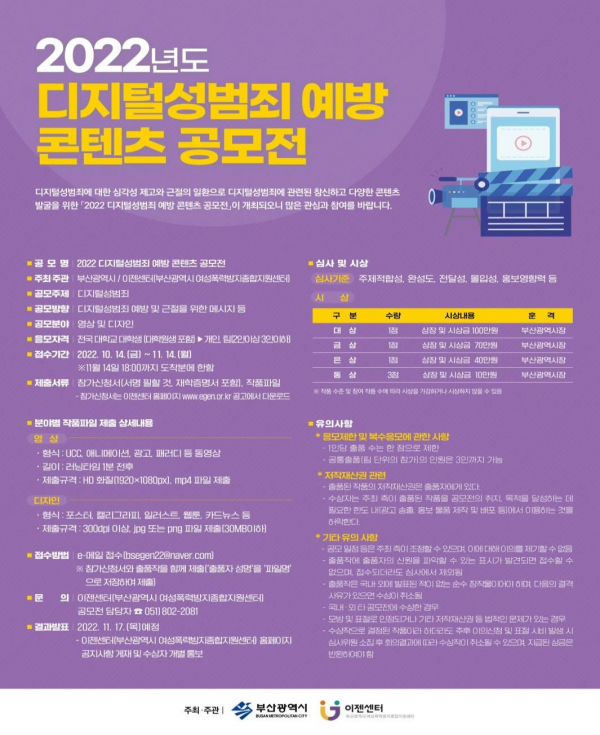 안경은 부산시 여성가족국장은 “공모전을 통해 일상생활에 깊이 스며든 디지털 성범죄의 심각성 및 예방에 대한 중요성에 대해 시민들의 공감대를 형성하는 계기가 되기를 바란다”며 “앞으로도 부산시는 디지털 성범죄에 대한 시민 인식 제고를 위한 다양한 사업을 추진해 나가겠다”고 전했다.
