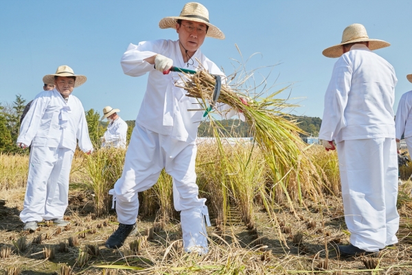 이날 행사는 박경귀 아산시장과 지역 어린이집 원생, 지역 농업인 등 400여명이 참여한 가운데 진행됐으며 참석자들은 낫으로 벼를 베고 탈곡기로 벼를 터는 전통 방식의 추수를 체험했다.