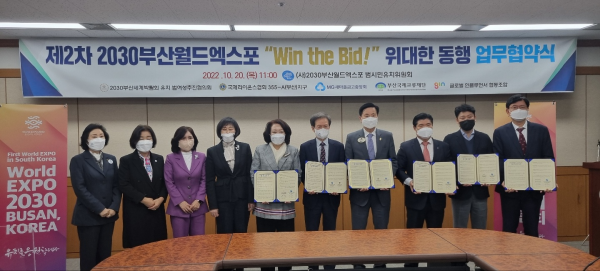 이들 기관·단체는 앞으로 2023년 개최지 발표일까지 2030부산세계박람회 유치 홍보, 범국민적 공감대 형성 등 다양한 협력사업을 추진할 예정이다.