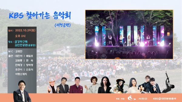 서천군이 후원하고 KBS 대전방송총국에서 주최·주관하는 이번 행사는 코로나19로 인한 우울감을 해소하고 문화적으로 소외된 지역을 찾아 트로트, 포크송, 색소폰 연주 등 다양한 장르의 문화공연을 선사하고자 마련됐다.