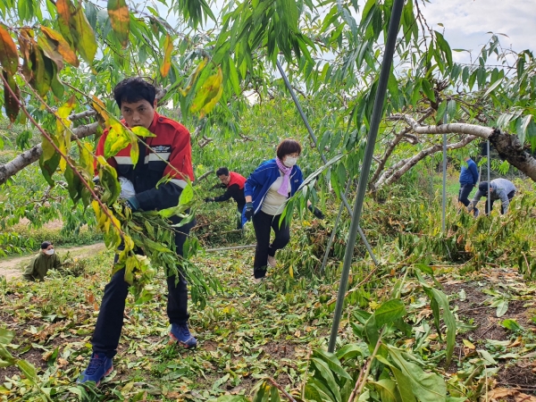 일손돕기에 나선 일동은 1,200평 복숭아 과원 전지 목 수거와 과원 정리 작업에 힘을 보태며 구슬땀을 흘렸다.