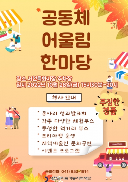한상일 서천군지속가능지역재단 사무처장은 “서천군 지역 주민들이 주체가 되어 먹고 보고 즐길 거리를 함께하는 공동체 어울림 한마당을 만끽하며 하나되는 화합과 소통의 장이 될 것으로 기대된다”고 밝혔다.