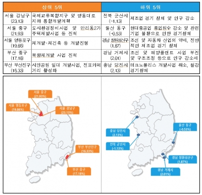 최고 변동 지역은 서울 강남구이고, 이어서 서울 중구, 서울 영등포구, 부산 중구, 부산 부산진구 순이며, 최저 변동 지역은 전북 군산시이고, 울산 동구, 경남 창원시 성산구, 경남 거제시, 충남 당진시 순으로 낮은 변동률을 보였다.