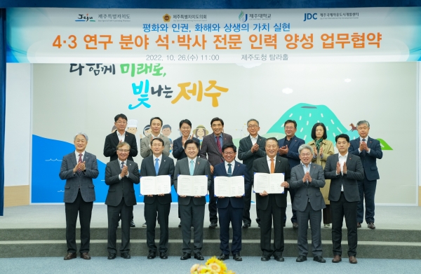 제주도는 26일 오전 11시 제주도청 본관 4층 탐라홀에서 제주도의회, 제주대학교, 제주국제자유도시개발센터와 ‘4·3 연구 분야 석·박사 전문인력 양성 업무협약’을 체결했다.