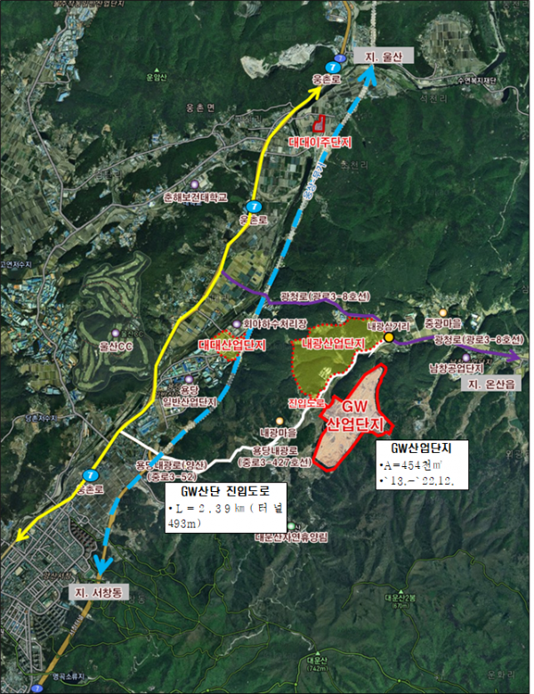 [충청뉴스큐] 울주군 온양읍 내광리에 위치한 지더블유일반산업단지를 지원하기 위한 진입도로가 2020년 3월 착공 후 2년 7개월만인 10월 28일 개통된다.