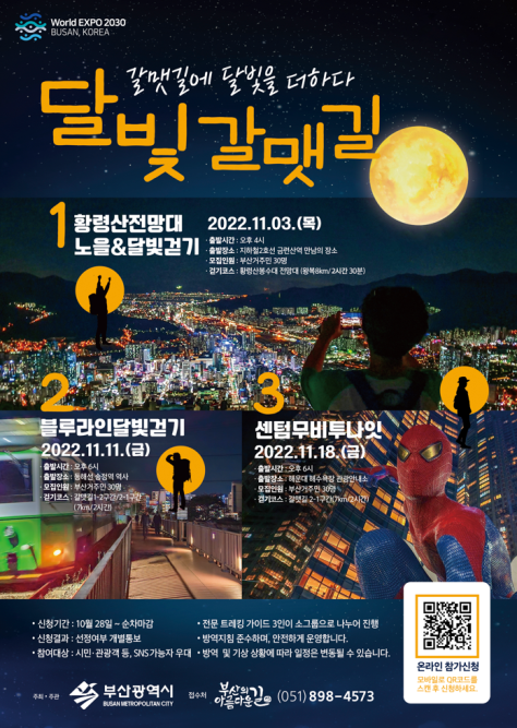 이번 행사는 야간에 갈맷길을 걸으며 부산의 야경, 맛집, 볼거리 등을 체험하는 프로그램으로 주요 야경명소 현장답사를 통해 3곳을 선정한 결과 11월 3일 황령산전망대 노을&달빛걷기 11월 11일 블루라인 달빛걷기 11월 18일 센텀 무비투나잇 순으로 진행될 예정이다.