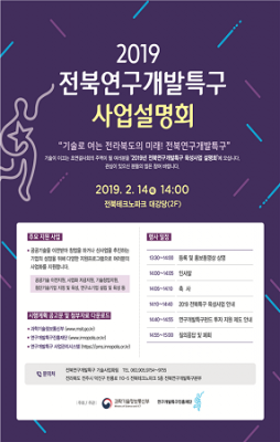 [충청뉴스큐] 전북도와 전북연구개발특구가 주관하는‘2019년 전북연구개발특구 사업설명회’가 오는 14일 오후 2시에 전북테크노파크 2층 대강당에서 개최된다.