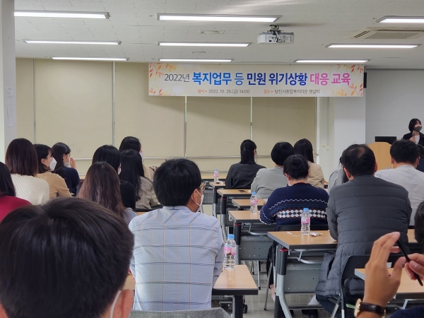 [충청뉴스큐] 당진시가 28일 당진시종합복지타운 햇살터 교육실에서 공공·민간기관 담당자의 복지업무 등 민원 처리 중 발생하는 위기 상황 대응 역량을 강화하고자 ‘복지업무 등 민원 위기상황 대응 교육’을 실시했다.