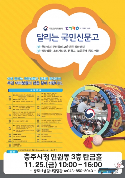 [충청뉴스큐] 충주시는 국민권익위원회와 함께 오는 25일 충주시청 민원동 3층 탄금홀에서 ‘달리는 국민신문고’를 운영한다고 밝혔다.