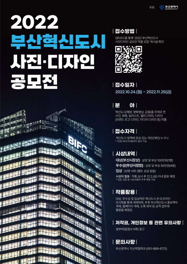 [충청뉴스큐] 부산시는 지역문화 진흥과 혁신도시 상생발전을 위해 ‘2022 부산혁신도시 사진·디자인 공모전’을 개최하며 11월 25일까지 혁신도시를 주제로 한 다양한 사진·디자인 작품을 모집한다고 밝혔다.
