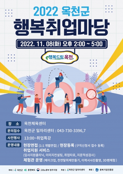 [충청뉴스큐] 옥천군은 구인·구직자 간의 만남의 장을 마련하기 위해 ‘2022년 옥천군 행복취업마당’을 오는 8일 옥천체육센터에서 개최한다.