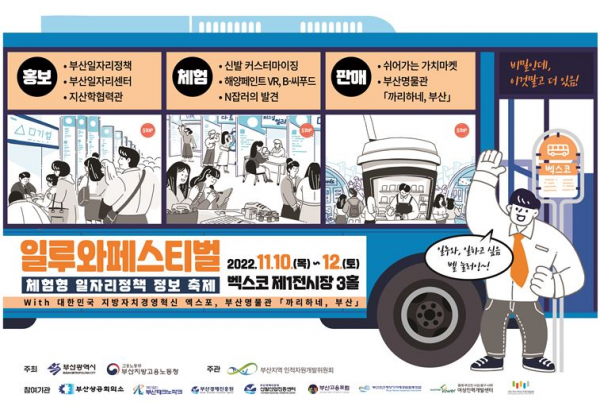[충청뉴스큐] 부산시는 부산 일자리 사업에 대한 정보를 체감형 콘텐츠로 만나볼 수 있는 체험형 일자리정책 정보 축제 ‘2022 일루와페스티벌’을 11월 10일부터 12일까지 사흘간 벡스코 제1전시장 3홀에서 개최한다고 밝혔다.