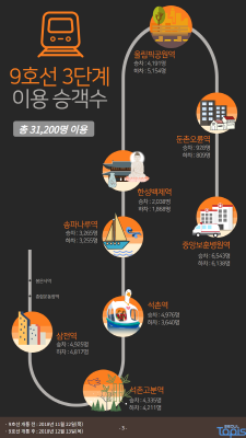서울시 토피스는 9호선 3단계 개통 이야기를 시작으로, 교통데이터에 담긴 서울시민의 일상을 카드 뉴스로 알기 쉽게 정리해 토피스 누리집 에 연재할 계획이다.