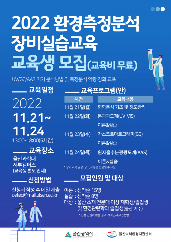 [충청뉴스큐] 울산시는 울산녹색환경지원센터 주관으로 11월 21일부터 24일까지 울산과학대학교 서부캠퍼스에서 지역환경인재 취업역량 강화를 위한 ‘2022 환경측정분석 장비실습교육’을 실시한다고 밝혔다.