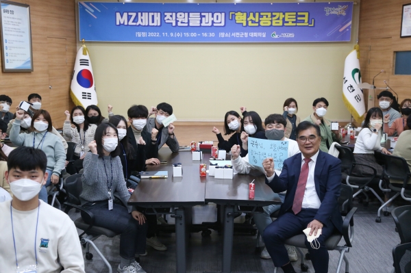 [충청뉴스큐] 서천군이 9일 군청 대회의실에서 김기웅 서천군수와 혁신 주니어보드, MZ세대 직원 40여명이 함께하는 ‘혁신공감토크’를 개최했다.