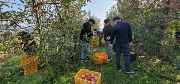 [충청뉴스큐] 예산군 재무과 직원 20여명은 지난 10일 농촌일손돕기를 위해 오가면 소재 사과 농가를 찾아 사과 수확을 도우며 구슬땀을 흘렸다.