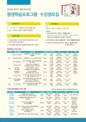 2019년 상반기 평생학습프로그램은 3월 11일부터 6월까지 운영하며 수강료는 무료이고 수업에 따른 재료비와 교재비는 수강생 부담이다.