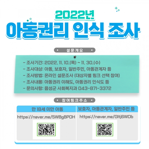 설문조사는 유엔아동권리 협약을 바탕으로 한 아동의 4대 권리 인지도와 음성군 아동권리보호 기반 조성 인식 등에 관한 것으로 아동, 보호자, 아동관계자, 공무원, 일반 주민 등을 대상으로 서면과 온라인으로 진행한다.