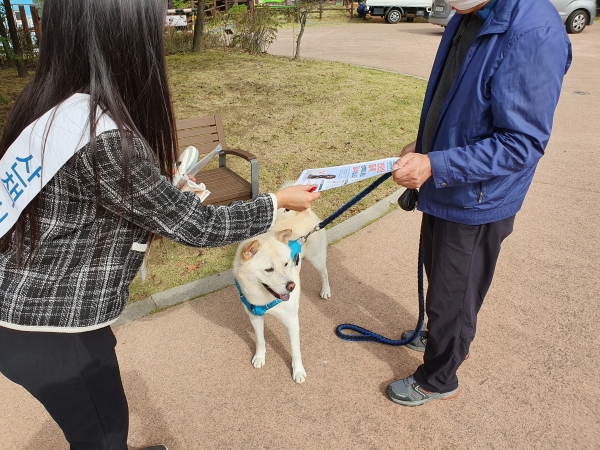 주요 홍보내용으로는 동물보호센터에서 반려동물 입양하기 반려동물 등록하기 맹견 소유자 맹견보험 의무가입 및 교육 이수하기 반려견과 동반 외출 시 2m 이내 목줄 착용 및 인식표 부착하기 등 반려동물 에티켓을 안내했다.