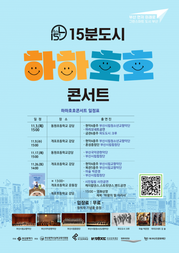 [충청뉴스큐] 부산시는 15분 도시 생활권 내 문화생활을 향유하는 체험 제공을 위해 오는 26일 오후 2시 부산진구 개포초등학교 강당에서 학교, 주민이 함께하는 ‘하하호호 콘서트’를 개최한다고 밝혔다.