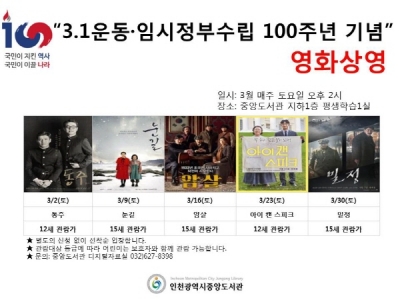 [충청뉴스큐] 인천광역시중앙도서관에서는 3월 한 달간 3.1운동·임시정부수립 100주년을 기념해 특별 영화를 상영할 계획이다.