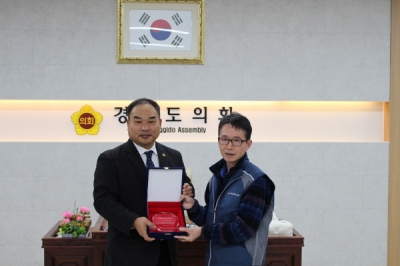 [충청뉴스큐] 경기도의회 안전행정위원회 박창순 의원이 14일 안전행정위원회 회의실에서 전국공무원노동조합 경기지역본부 경기도청지부장으로부터 ‘모범도의원 감사패’를 받았다.